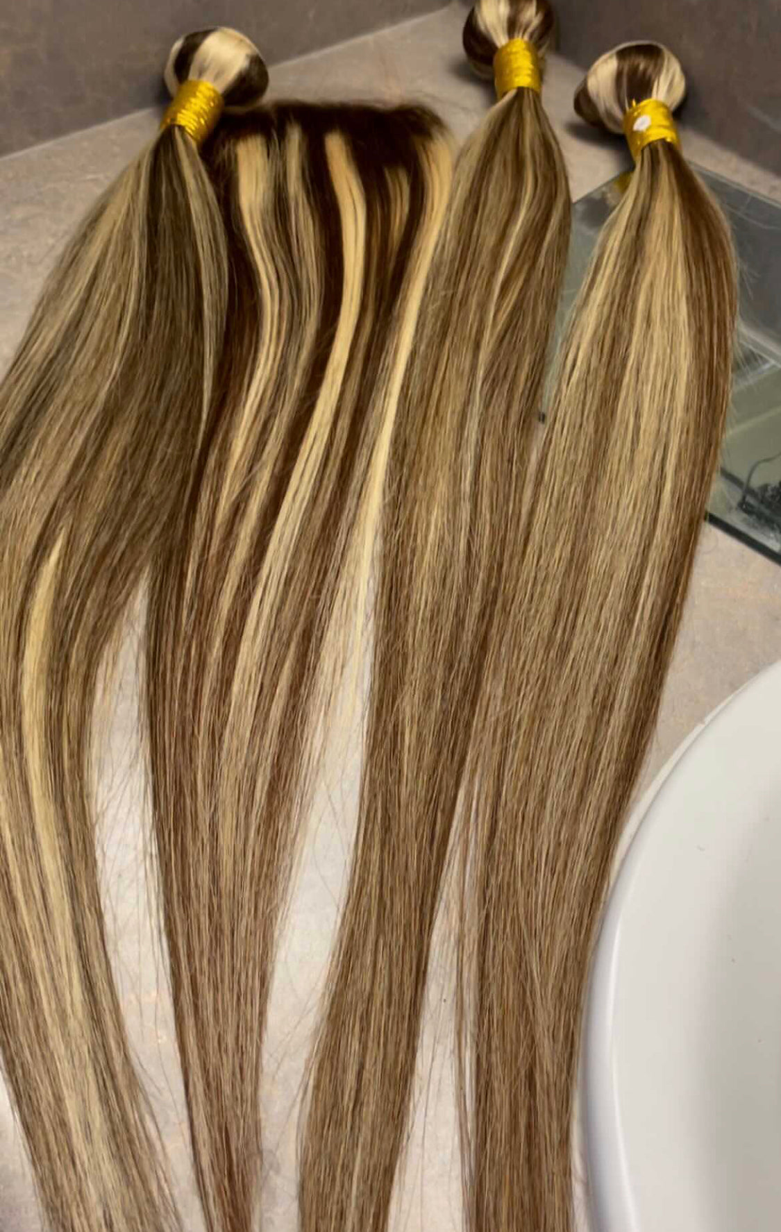 The 4/613 Highlight 3 Bundles set brings together a bold mix of deep brown and platinum blonde for a bright, defined look. The straight strands deliver a smooth texture and natural flow, perfect for full installs or custom wig construction. With three bundles included, you'll have just the right amount of volume and length for a complete style.